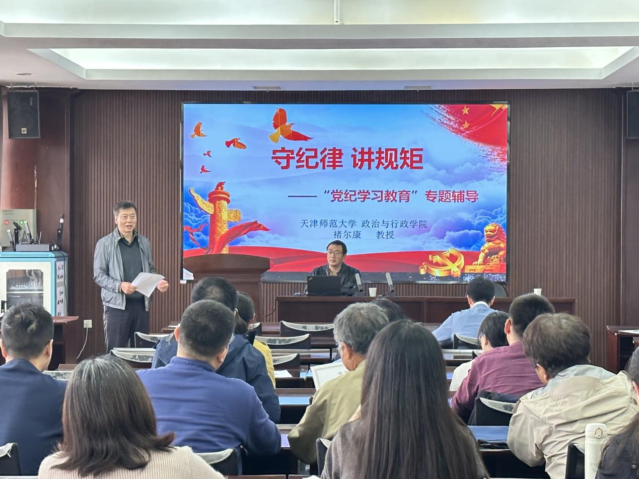 褚尔康教授以案为例为全体教师解读《中国共产党纪律处分条例》,从教师角度、从党员角度阐释说明“守纪律,讲规矩”的重要意义和具体要求,引导学院全体教师把纪律建设摆在更加突出的位置,自觉用党规党纪校正思想和行动,并以“教育家精神”和“四有”好老师为职业标准,努力为学校的高质量发展贡献力量。