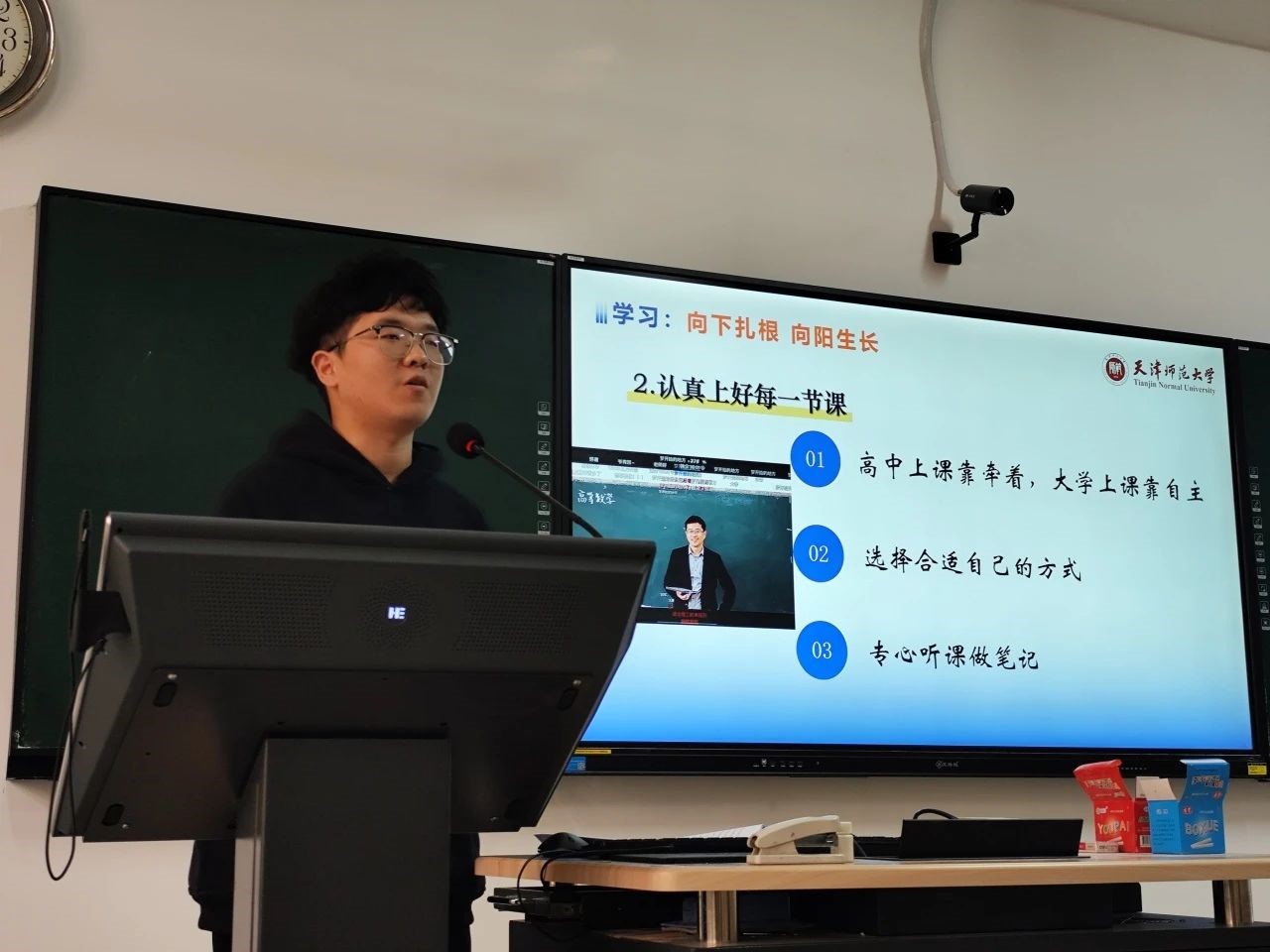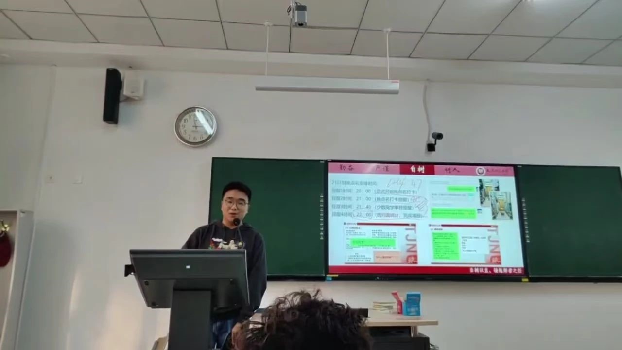 地理学部地理科学(师范)专业的谢子豪同学,获评“市级优秀学生干部”称号。他分享了他的获奖与学习经历,并向在座的学生骨干传授工作经验。对如何平衡并高效地完成工作任务和学习任务给出了他的答案。
