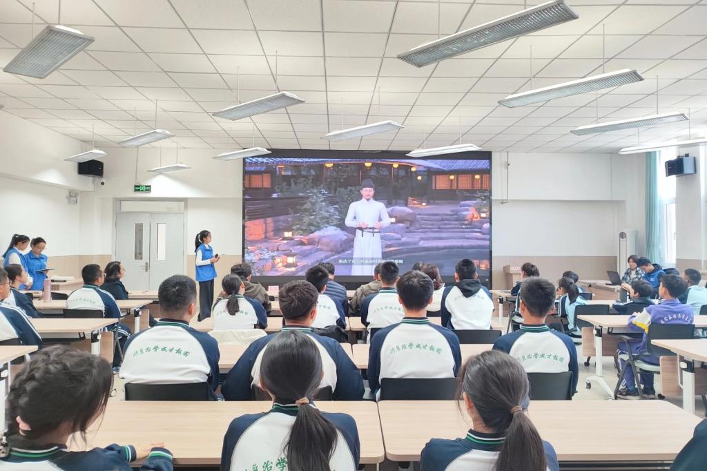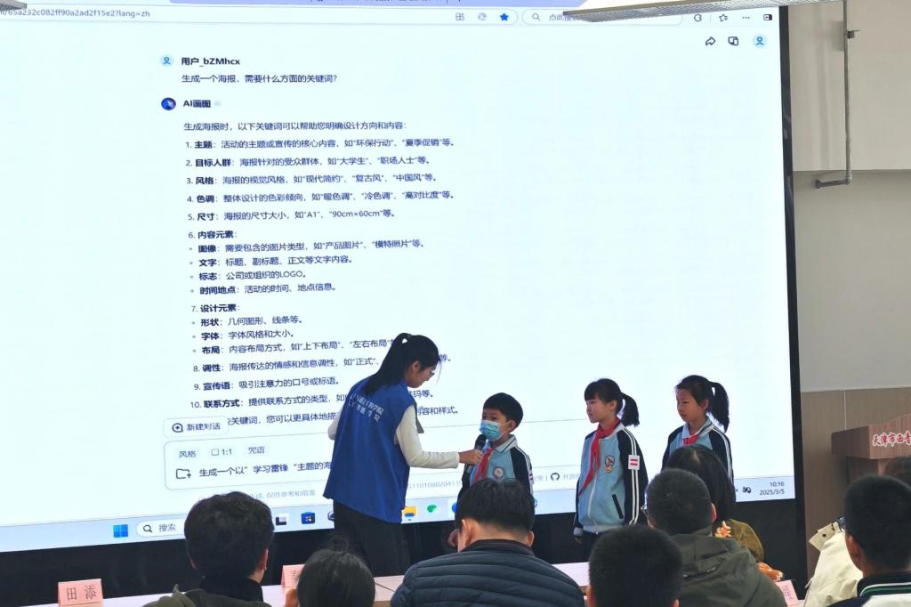 在随后的AI应用体验环节,科普讲解志愿者邀请了现场听讲的学生们上台亲身参与互动,体验人工智能技术的实践操作。志愿服务团引导学生利用AI工具,根据提供的关键词生成雷锋主题的海报,并通过描述生成李白讲解视频。人工智能平台在极短的时间内就生成了精美的作品。现场的老师和同学们对此赞叹不已。这些互动体验不仅让学生感受到人工智能的强大功能,也激发了他们的创造力和想象力。