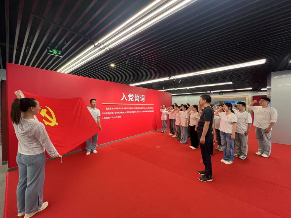 在鲜艳的党旗照耀下,全体党员举起右拳庄严宣誓,向党的生日深情献礼。